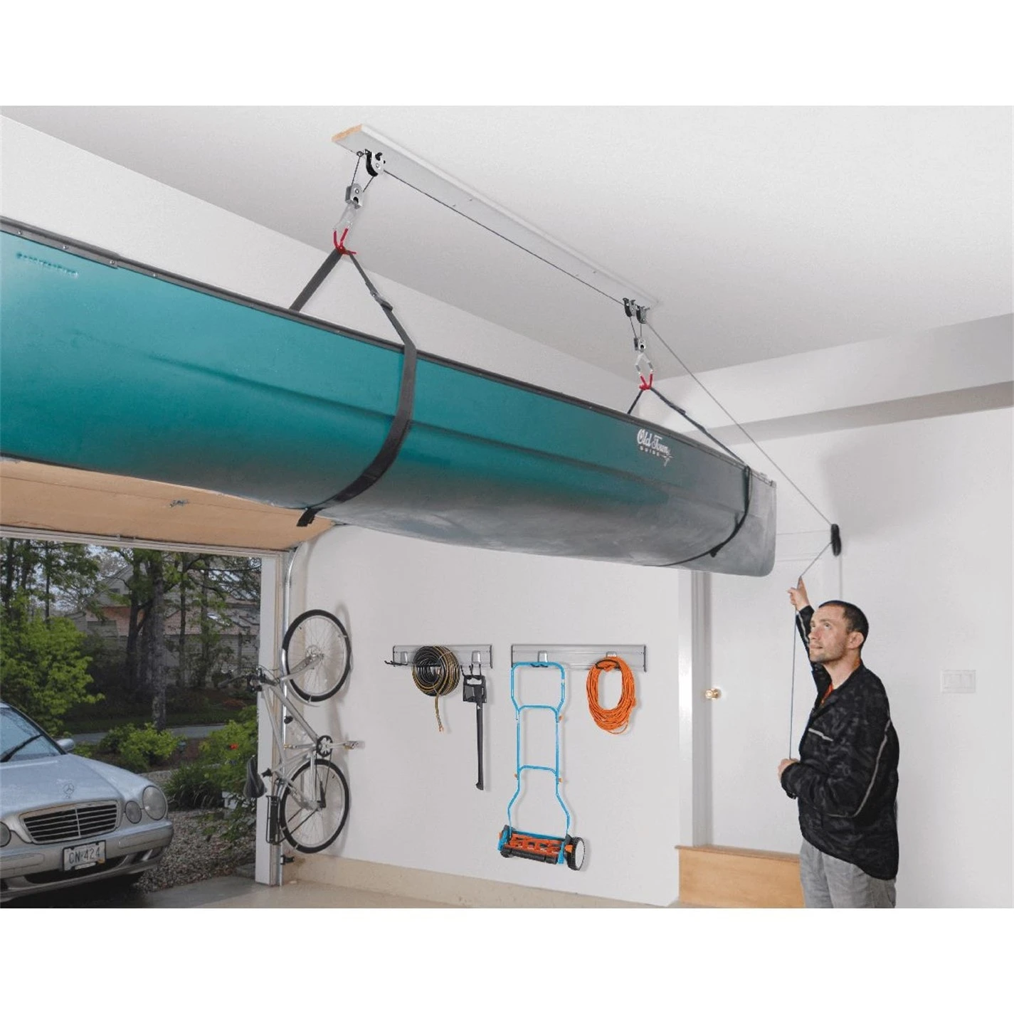 Easy to use ceiling hoist holds bicycles, kayaks, ladders etc to maximise your storage.