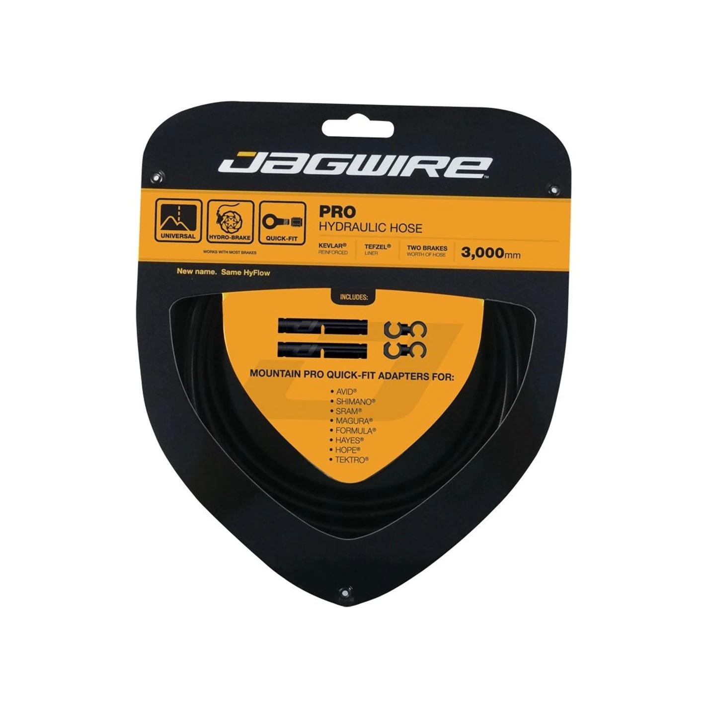 With more disc brake platforms on the market than ever before, fitting hydraulic hoses can be compLEX and frustrating. That’s why we developed the Quick-FitTM adapter system, a foolproof approach utilizing proven caliper-adapter technology from the motorcycle world. Pro hydraulic hoses make it safe and easy to dial in a perfect fit. A Kevlar weave surrounds the Tefzel inner liner, preventing any bulges due to heat building up or extreme braking pressure. Each hose comes with 2 pre-installed caliper-side universal couplers. Cut the hose to the correct length, attach the appropriate Quick-FitTM Adapter for the brake system (sold separately), and it’s ready to install. A Kevlar weave surrounding the liner prevents hose expansion due to heat buildup or extreme pressure. Each hose has 2 caliper-side universal couplers that connect to Jagwire Quick-FitTM Adapters (sold separately). Pro Hydraulic Hose kits are available in 12 colors and finishes. Black kits contain gloss black housing with silver logos; Stealth Black kits have matte black housing featuring black logos.