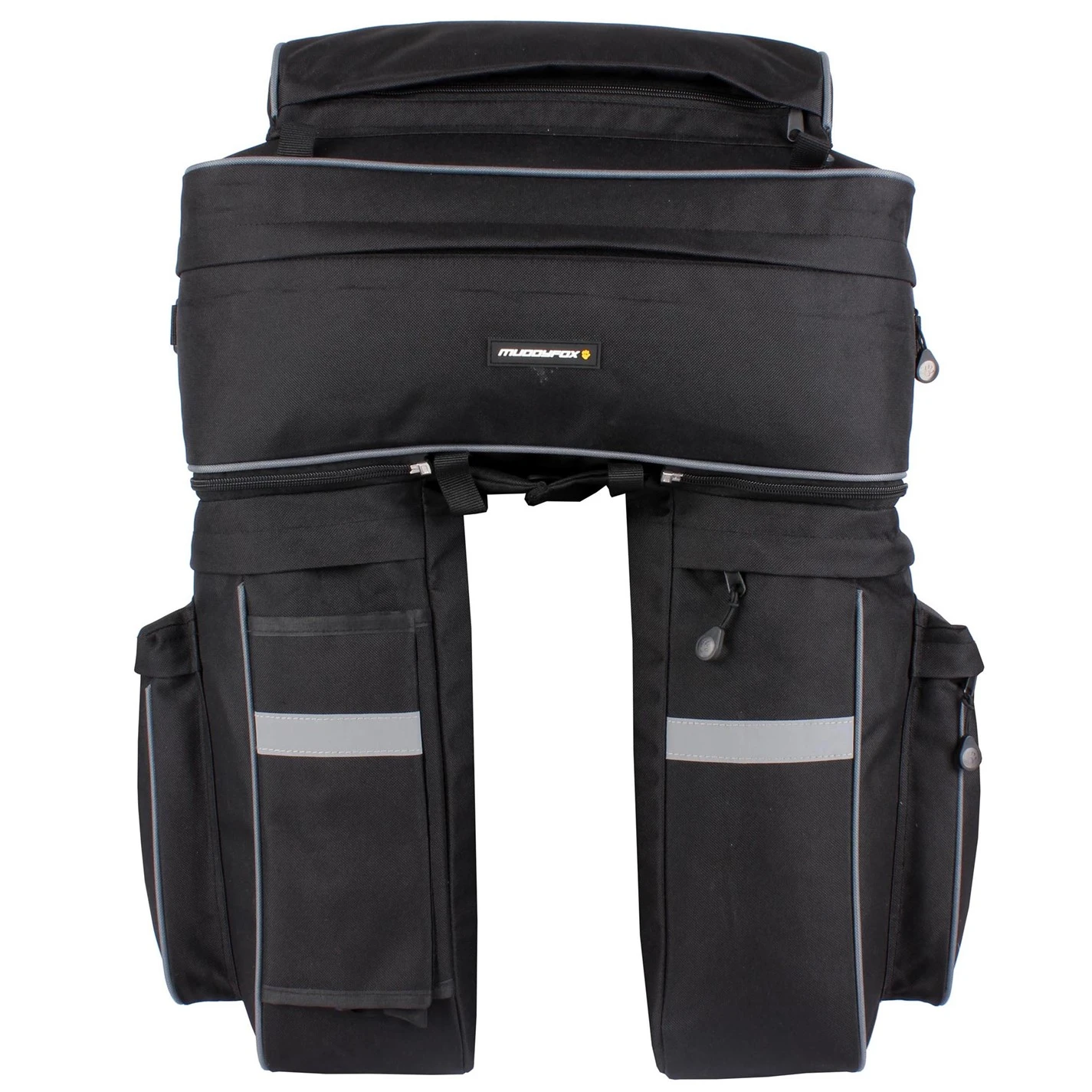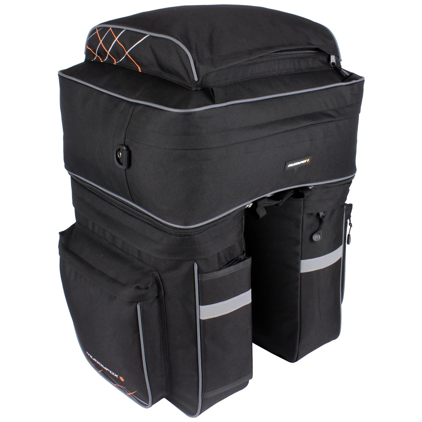This Muddyfox Pannier Bag is ideal for commuters or touring. It is designed to carry your essentials, kit and cycling gear, while the tool free installation gets you up and running quicker. It has a large zip up expandable compartment to the top plus two zip pockets to the sides, security straps, reflective detailing and Muddyfox branding to finish.