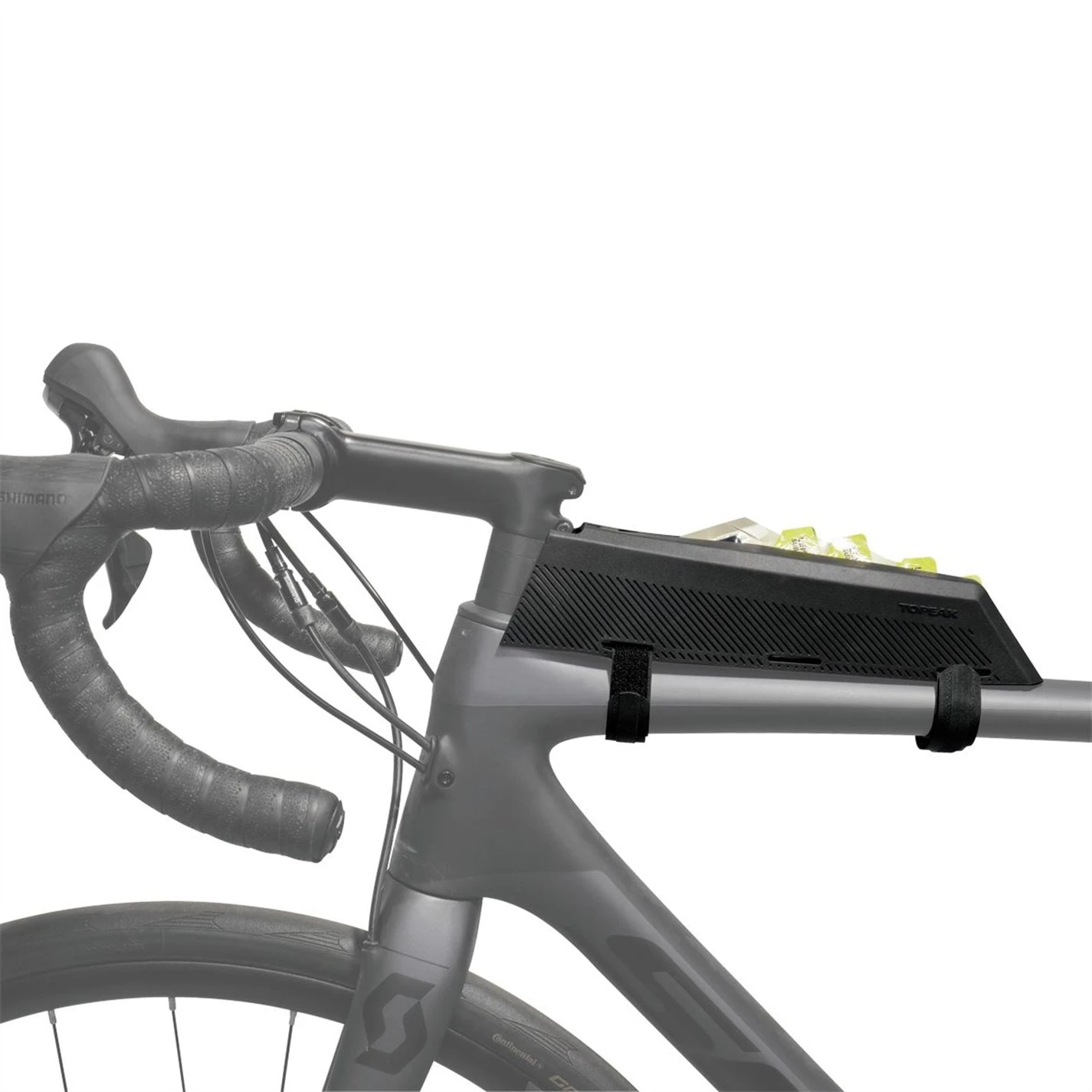 An aerodynamic top tube box which minimizes wind drag while eliminating interference with legs. Mounts by built-in top tube integrated bosses or secure scratch-free straps.